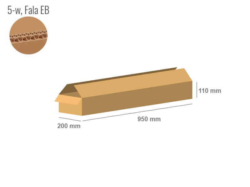Specifications: Cardboard: Double Wall(5-layer), 580 g/m2, flute EB Model: FEFCO 201 Closure: Flaps Color: Grey Internal dimensions Length: 950 mm Width: 200 mm Height: 110 mmIf you are looking for an effective way to package your shipments, we highly recommend our corrugated cardboard boxes. Made of durable corrugated cardboard, they provide reliable protection for your products. Furthermore, they are environmentally friendly and offer a cost-effective solution.